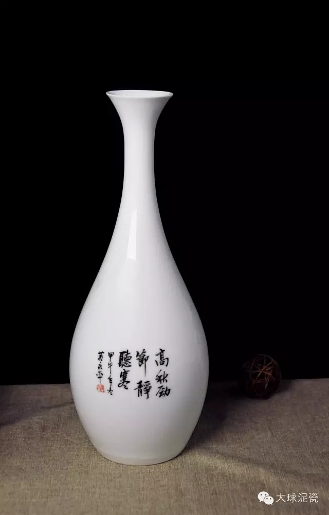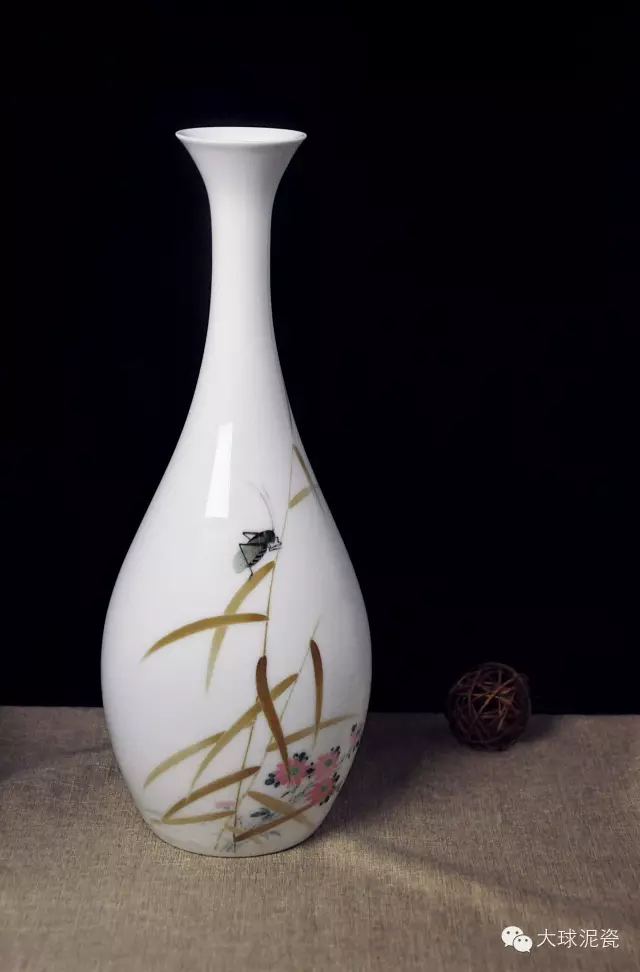 《高秋靜節(jié)》瓶,由省級工藝美術(shù)大師創(chuàng)作,瓶身高:35厘米,口徑:6厘米,足徑:8厘米。以大球泥為主要原材料,高溫?zé)贫,瓶身曲線優(yōu)美柔和,瓷質(zhì)溫潤如玉,份量感十足!陡咔镬o節(jié)》瓶,長頸削肩,腹下豐滿,賦予了整個(gè)瓶身高雅氣質(zhì)!陡咔镬o節(jié)》瓶,用大球泥瓷依托繪畫賦予了陶瓷的全新形式,將瓷器更高的藝術(shù)內(nèi)涵展現(xiàn)出來,具有藝術(shù)收藏價(jià)值。