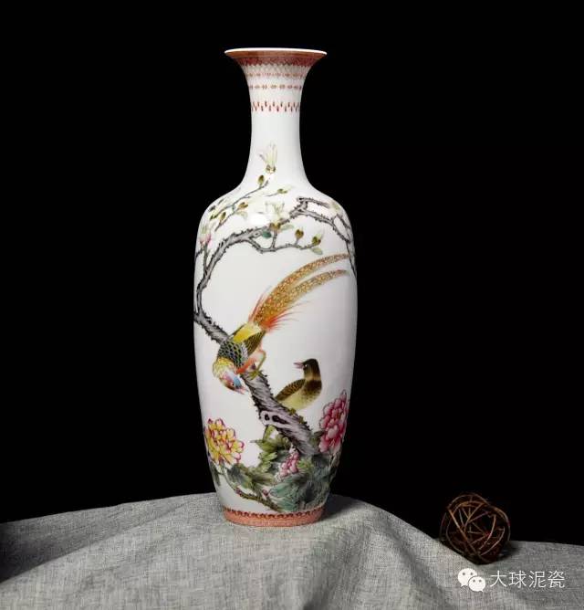 《錦堂高貴》柳葉瓶,由省級(jí)工藝美術(shù)大師徐國(guó)明創(chuàng)作,以大球泥為原材料。胎骨細(xì)白堅(jiān)致,釉質(zhì)光潔瑩潤(rùn),繪工細(xì)膩。