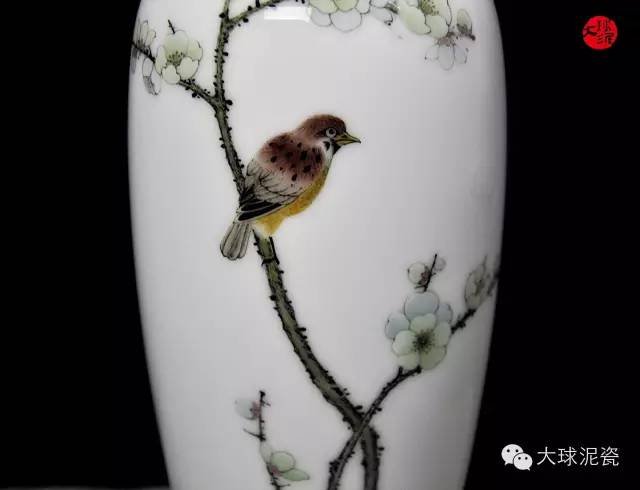 花鳥為國(guó)畫常用的題材,作者借鑒國(guó)畫的繪畫方式,釉下五彩的工藝制作,將花鳥形象躍然大球泥瓷之上,層層疊疊盛開著的梅花與生動(dòng)活潑的雀鳥成對(duì)比,二者極為和諧。雀鳥的神情,動(dòng)作以及身上的羽毛紋路都描繪的惟妙惟肖,宛若真物,及其傳神。梅花寒風(fēng)中綻放,嬌艷美麗,仿佛能聞到它的芬芳。這樣一幅極具觀賞價(jià)值的大球泥瓷藝術(shù)作品,極為適合擺放家中,其獨(dú)到的藝術(shù)韻味,極其雅致的色澤配比,著實(shí)使人身心暢快。