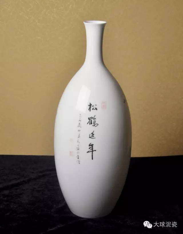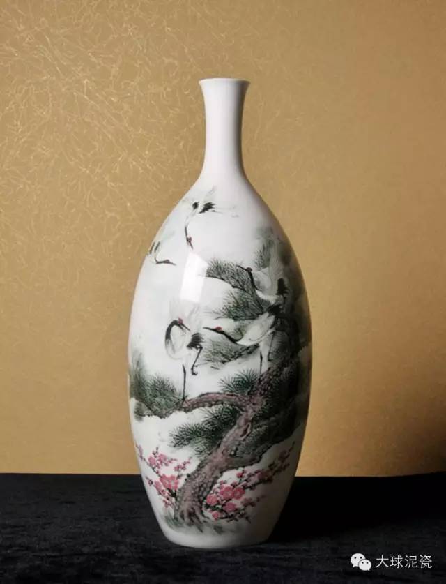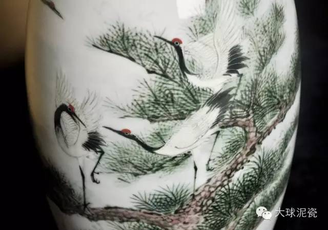 此《松鶴延年》瓶由藝美術大師孫新水先生(已故)于2005年創(chuàng)作,是其優(yōu)秀代表作品之一。采用釉下五彩的工藝,瓶高40cm,器型規(guī)整,肩、底略收,顯示出沉穩(wěn)大氣之風。頸部拉長,堅韌挺拔,提升了整個作品的氣勢和腔調。畫面中一枝勁松虬身宛轉,松針茂密。枝干上立著三只仙鶴,神采飛揚,精神飽滿,栩栩如生。其窈窕而立的風姿,宛若仙人?罩械膬芍幌生Q雙翅張開,自在從容地飛翔在天空中,目光如炬,直視前方,給人一種安定、祥和的感覺。松樹旁幾株梅花開放,顏色艷麗卻又不失雅致。整幅畫面呈現(xiàn)出一種靈活生動,淡妝濃抹總相宜的舒適感,讓人愛不釋手。