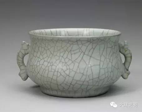 哥窯的主要特征是釉面有大大小小不規(guī)則的開裂紋片,俗稱“開片”或“文武片”,這是發(fā)生在釉面上的一種自然開裂現(xiàn)象,原本是瓷器燒制中的缺陷,后來人們掌握了開裂的規(guī)律,有意識地讓它產(chǎn)生開片,從而形成了一種獨特的美感。細(xì)小如魚子的叫“魚子紋”,開片呈弧形的叫“蟹爪紋”,開片大小相同的叫“百圾碎”。