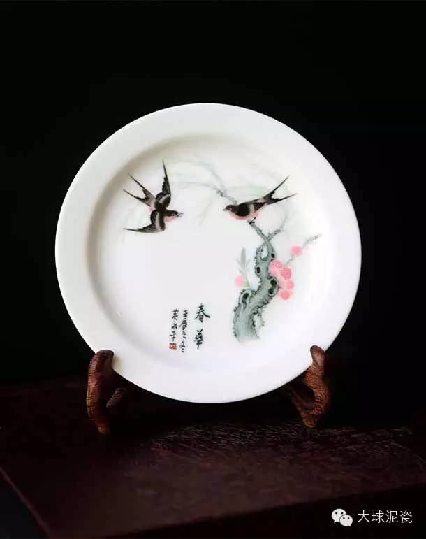 《春華》瓷盤,由工藝美術(shù)大師創(chuàng)作,采用釉下五彩工藝。賀知章有一首著名的七言絕句《詠柳》,其中寫道“碧玉妝成一樹高,萬條垂下綠絲絳!碧拼膶W