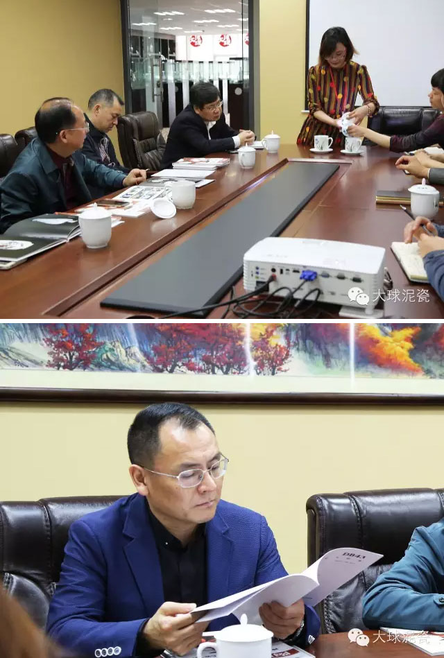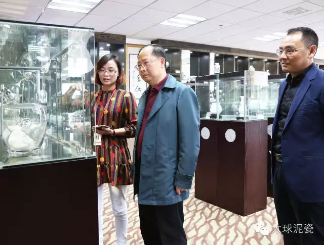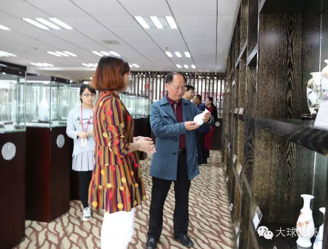 楊部長(zhǎng)一行首先來(lái)到展示廳,仔細(xì)聽(tīng)取了公司副總經(jīng)理張萍對(duì)大球泥原料的形成、發(fā)現(xiàn)、存量以及大球泥瓷特點(diǎn)的介紹,并對(duì)大球泥瓷的經(jīng)典作品逐一進(jìn)行了講解。在會(huì)議室,公司董事長(zhǎng)滕召華從大球泥原料的搶救性保護(hù)、公司的成立、研發(fā)利用、專(zhuān)利技術(shù)、宣傳推廣、未來(lái)規(guī)劃以及需要解決研發(fā)中心用地問(wèn)題等幾個(gè)方面做了匯報(bào)。