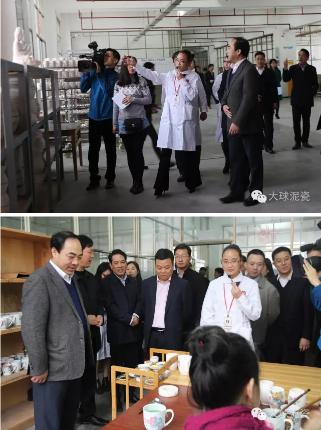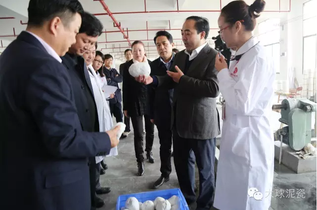 在公司董事長滕召華的陪同下,陽市長一行下車后直奔大球泥瓷生產(chǎn)、創(chuàng)作區(qū)。在大師創(chuàng)作室,陽市長詳細詢問了釉下彩的繪制工藝及創(chuàng)作靈感等,特別強調(diào)是否原創(chuàng)。來到練泥及制模區(qū),問到器型設計情況和大球泥原料的用量配方。陽市長對大球泥十分了解,他揀起一坨大球泥向隨行人員做起了解說:大球泥挖掘出來,就是雪白團狀,是一種不可再生資源,現(xiàn)已枯竭。上個世紀因“毛瓷”而聲名遠揚,有著厚重的歷史底蘊。目前僅存于世的百余噸大球泥都被滕召華搶救性保護起來了,現(xiàn)在是用一坨少一坨!