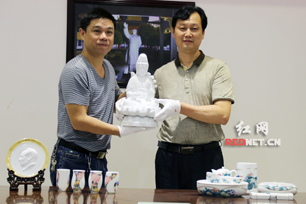 隨后,《觀世音》瓷像及《和平》套具、《毛澤東主席浮雕瓷像》《民族風(fēng)》手握杯等四套作品被放入醴陵陶瓷博物館內(nèi)展出,廣大瓷藝愛好者可在醴陵瓷谷醴陵陶瓷博物館三樓欣賞到這四款精品!熬栀(zèng)只是個(gè)儀式,更多的則是擔(dān)當(dāng),大球泥瓷藝有責(zé)任把‘大球泥’品牌作為湘瓷乃至中國高端藝術(shù)瓷的品牌標(biāo)桿來打造,借力‘一帶一路’把湘瓷品牌推出國門走向世界!彪偃A表示。