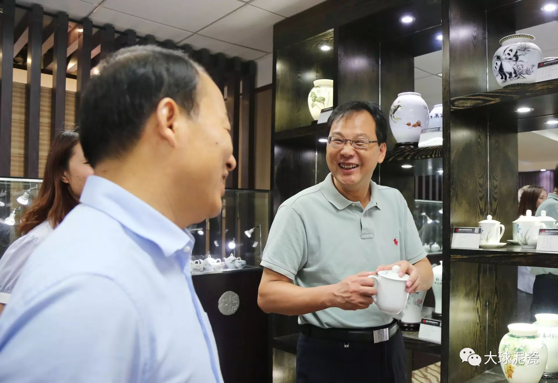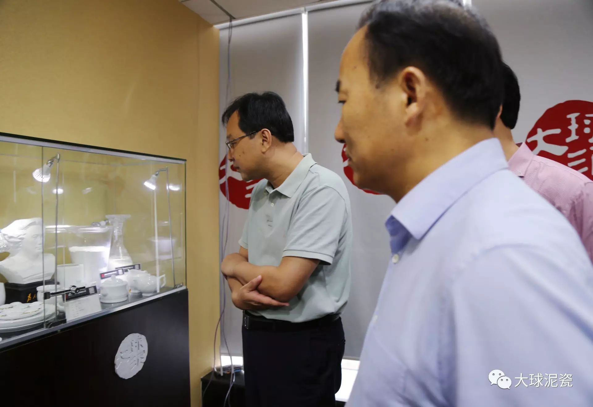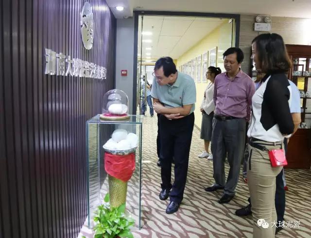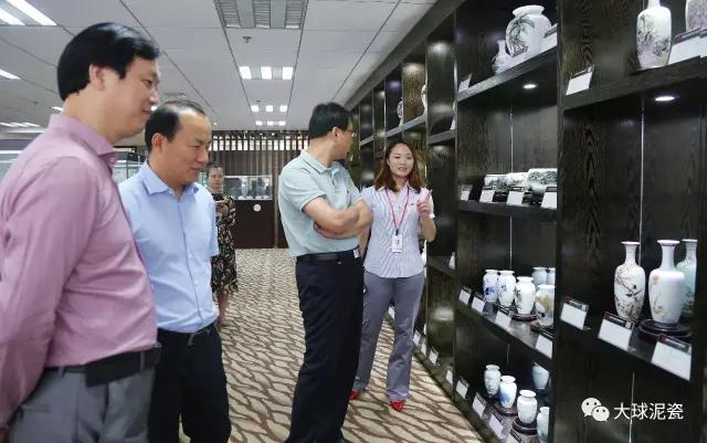 程主任、高部長(zhǎng)一行在滕董的陪同下參觀了大球泥瓷精品展廳,仔細(xì)聽(tīng)取了工作人員對(duì)大球泥原料的形成、發(fā)現(xiàn)、存量以及大球泥瓷各種器型、工藝、畫(huà)面特點(diǎn)的介紹。
