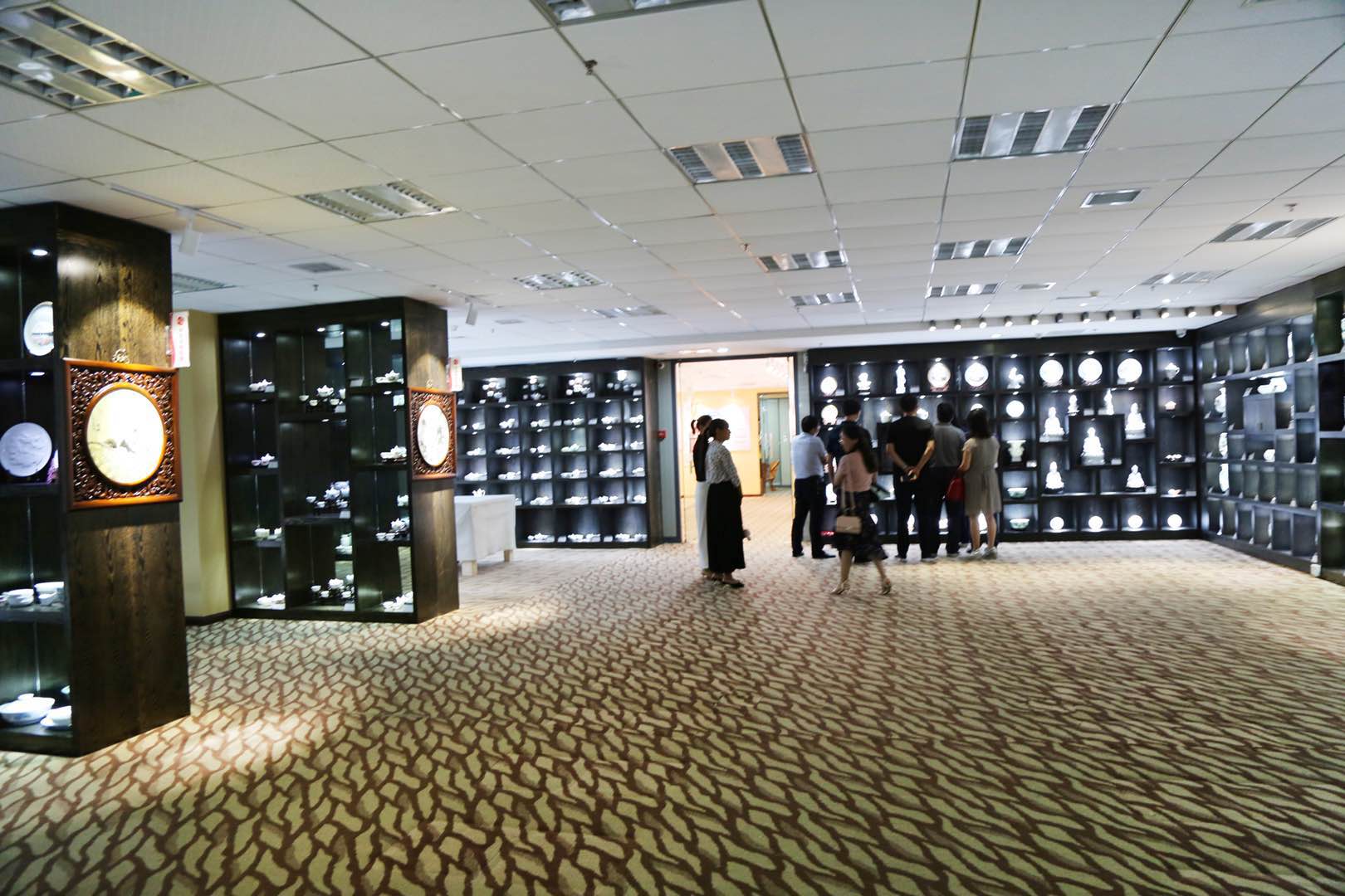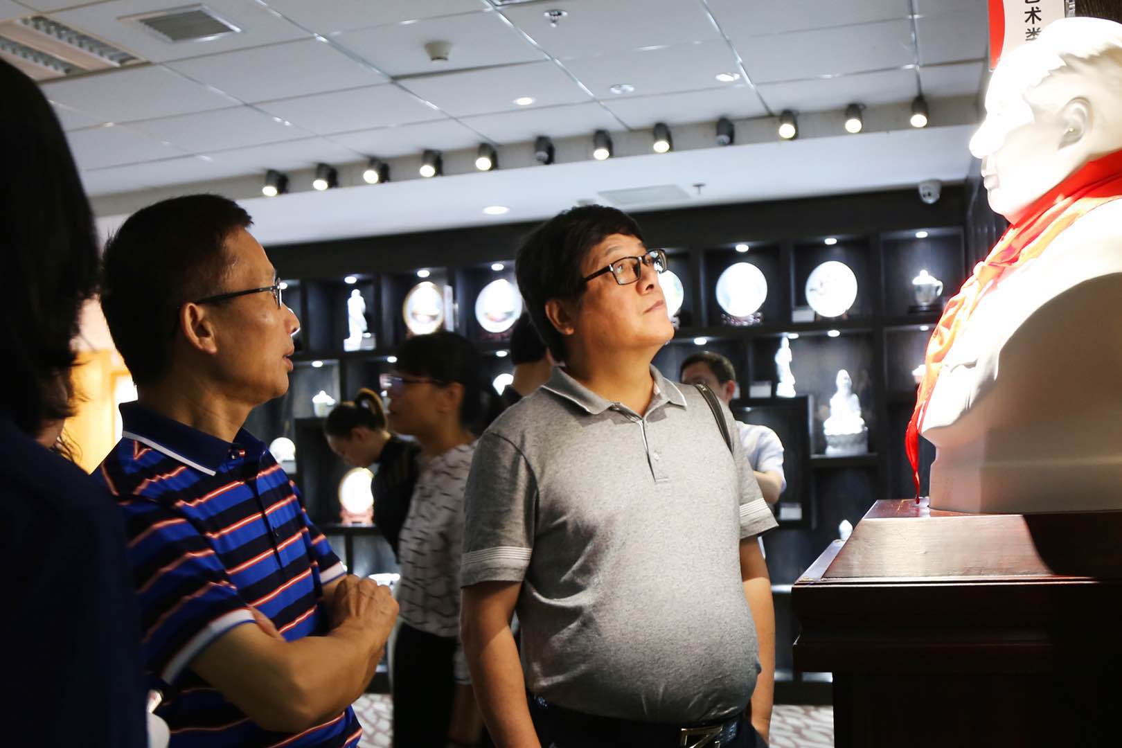 隨后考察團(tuán)移步到大球泥產(chǎn)品展示廳,參觀了紅色偉人系列、祈福平安系列、藝術(shù)收藏系列、生活定制系列、景區(qū)文創(chuàng)系列、外交國禮系列等產(chǎn)品(作品)。當(dāng)講解員把大球泥和優(yōu)質(zhì)泥同一器型的杯子放到燈光下后,考察團(tuán)一行都驚訝了,一個潔白、溫潤、通透,一個泛黃、暗淡、渾暈,異口同聲感慨到大自然的鬼斧神工,大球泥瓷實(shí)屬不可多得的瓷中精品?疾靾F(tuán)何團(tuán)長還挑選了一把壺上手,細(xì)細(xì)撫摸,慢慢回味,說大球泥瓷的感覺就是有說不出的爽!
