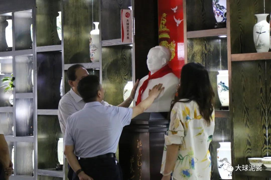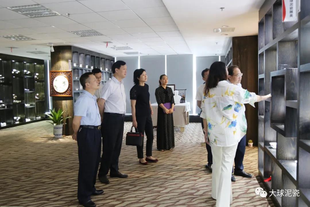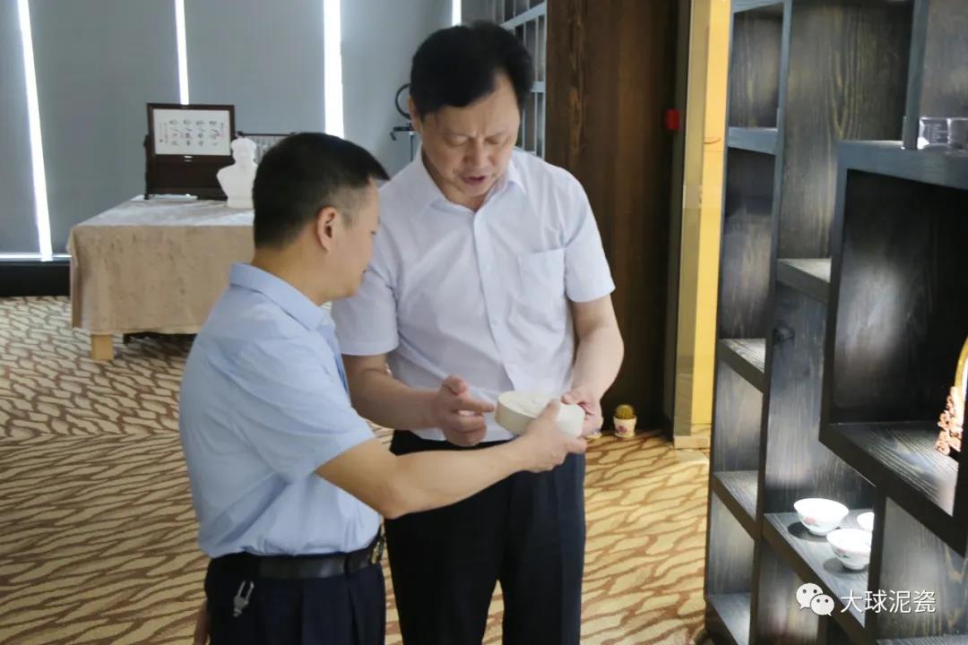 賀廳長(zhǎng)一行首先參觀了公司的精品展廳,常務(wù)副總張萍作了專(zhuān)業(yè)講解。賀廳對(duì)映入眼簾的大球泥原料產(chǎn)生了興趣:“這個(gè)雪白球狀的原料是經(jīng)過(guò)加工提煉的?”滕總回答:“從地下挖出來(lái)就是這個(gè)樣子。大球泥是偉晶巖風(fēng)化物,全部為橢圓球狀,一般在20cm大小, 雜質(zhì)都集中于球體中心形成一個(gè)內(nèi)核,是世上極為稀有的非金屬礦石!痹诳吹搅宅槤M目的高端藝術(shù)陶瓷時(shí),他被深深吸引了,拿著大球泥作品和普通泥作品在燈光下進(jìn)行比較,發(fā)現(xiàn)一個(gè)白、潤(rùn)、透,一個(gè)黃、渾、淡,問(wèn)兩個(gè)作品的厚度是否一樣,滕董答兩個(gè)作品的厚度、畫(huà)面完全一樣,但品質(zhì)效果明顯不同。郭局長(zhǎng)則打開(kāi)手機(jī)燈光對(duì)大球泥的杯子和優(yōu)質(zhì)泥杯子反復(fù)照探,比較差異。其他領(lǐng)導(dǎo)也是提問(wèn)不斷,工藝技術(shù)、產(chǎn)品質(zhì)量、創(chuàng)作風(fēng)格、市場(chǎng)細(xì)分等等。
