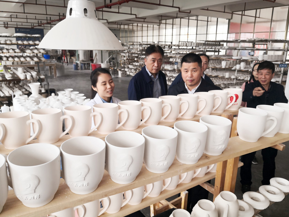 觀展廳,贊精品。領(lǐng)導們參觀醴陵展廳,姚總匯報了大球泥瓷作品的三個特點:一是畫面留白三分之二,充分展現(xiàn)瓷質(zhì)。二是作品設(shè)計精美雅致,都是小而美的精品。三是獨特的浮雕亞光工藝,融合釉下五彩技藝。