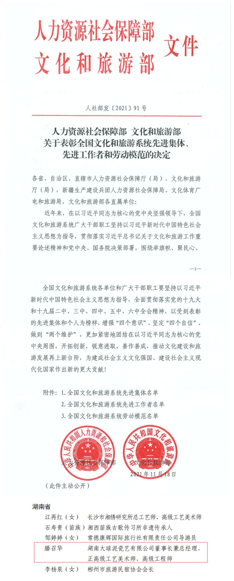 日前,國家人力資源社會保障部及國家文化和旅游部聯(lián)合印發(fā)了《全國文化和旅游系統(tǒng)先進集體、先進工作者和勞動模范的決定》,公司董事長滕召華被授予“全國文化和旅游系統(tǒng)勞動模范”稱號。這是2018年國家文化部和國家旅游局合并后的第一次評選活動,從今年1月份開始層層推選,經(jīng)過三級公示,最后評選出全國勞動模范95位,湖南僅5位。