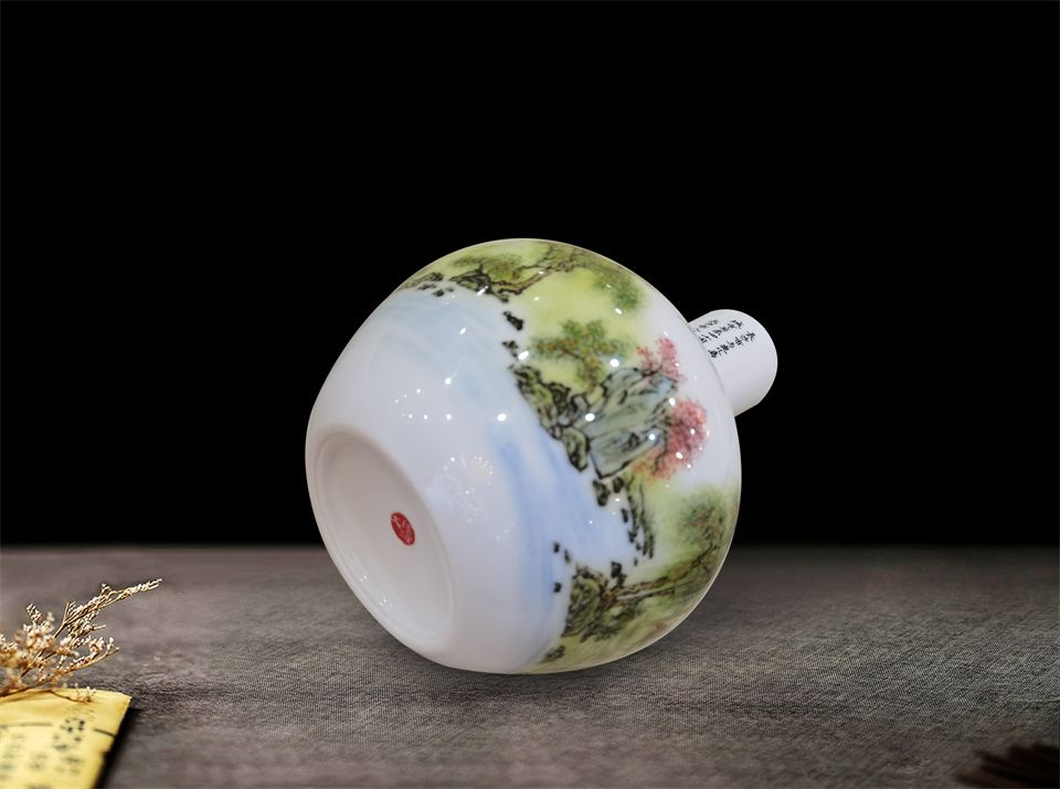 《友誼》瓶,選用中國陶瓷最經(jīng)典器型,瓶型為直口、長頸、豐肩、圓腹、淺圈足,造型古典端莊,線條優(yōu)美圓潤。以稀缺大球泥為原料,用釉下高溫工藝三次燒制而成。畫面以兩個城市最具代表性的風(fēng)景為題材,長沙的岳麓山愛晚亭與鹿兒島的櫻島火山景交相輝映、融為一體,寓意兩個城市山水相依、睦鄰友好、共同發(fā)展。