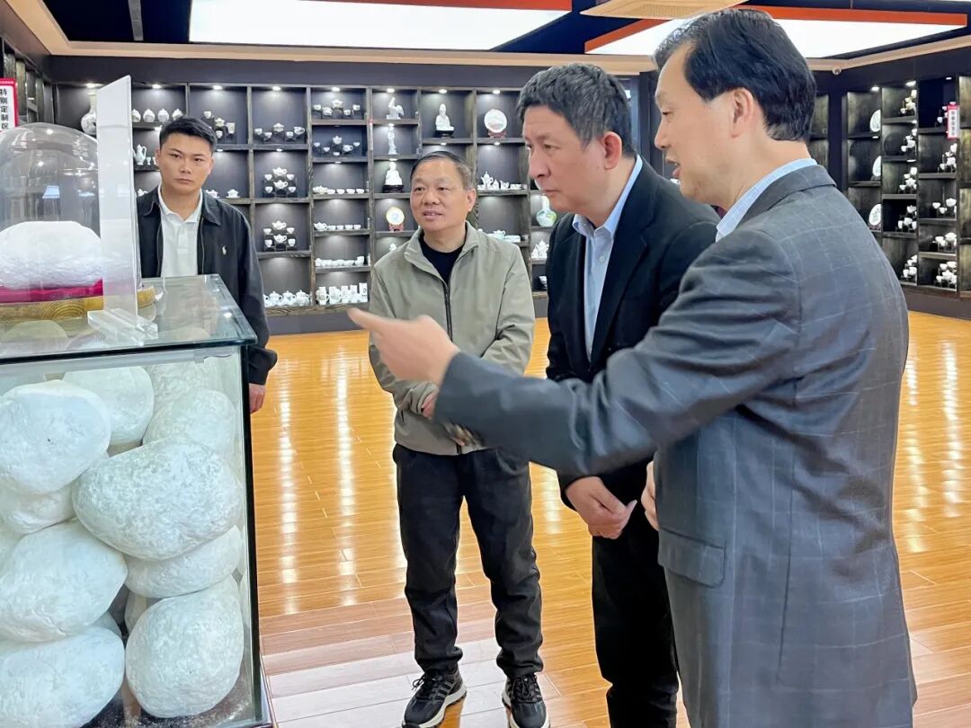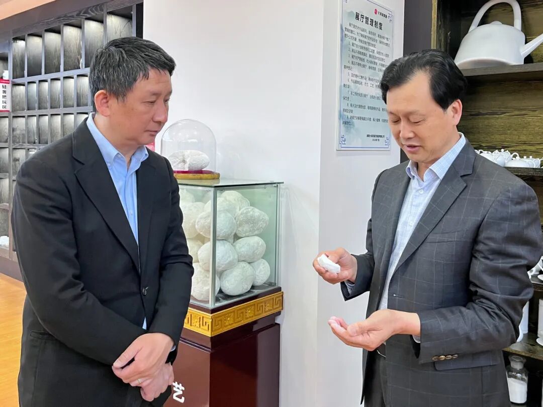 在董事長滕召華的陪同下,王效芝先生一行走進大球泥展廳,近距離感受“泥黃金”的傳奇魅力。面對全球十分珍稀的大球泥原料,王效芝先生駐足感嘆:“大球泥真是老天傳下來最完美的非金屬礦石”。