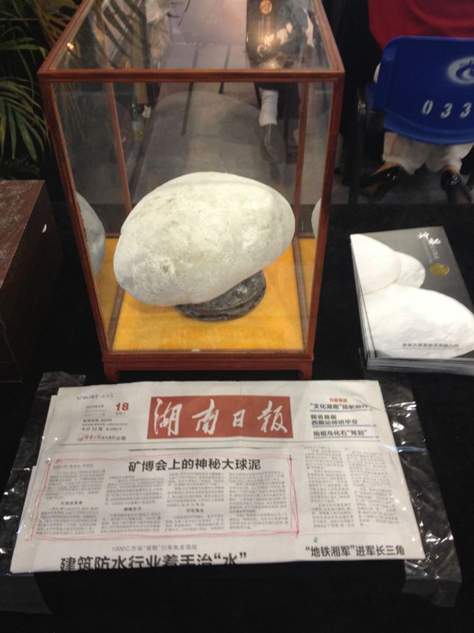 大球泥是偉晶巖風(fēng)化物,雪白球狀體,形似恐龍蛋;含鋁量極高,含鐵量極少,是制作陶瓷的稀缺原料。至今世界只發(fā)現(xiàn)兩個(gè)礦源,一個(gè)是英國(guó),二戰(zhàn)時(shí)枯竭;一個(gè)是湖南雪峰山,上世紀(jì)八十年代枯竭,F(xiàn)存于世就一百多 噸,絕大部分被大球泥瓷藝公司搶救性保護(hù)收藏,并審慎研究、開發(fā)、利用。