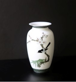 “一樹獨(dú)先天下春”瓶,瓶高20cm,口徑為8cm,足徑為5.5cm,器型俗稱為藕瓶。瓶型線條簡潔流暢端莊。因以大球泥為主要原料制成,故瓶胎體晶瑩剔透,畫面特別溫潤。藝術(shù)大師以“鵲鳥聲喈喈,枝頭好落。淡淡東風(fēng)色,暗香微動(dòng),天下春”的寓意而將作品題寫為“一樹獨(dú)先天下春”,詩情畫意躍然于瓶上,是一件難得一見的珍稀藝術(shù)品。