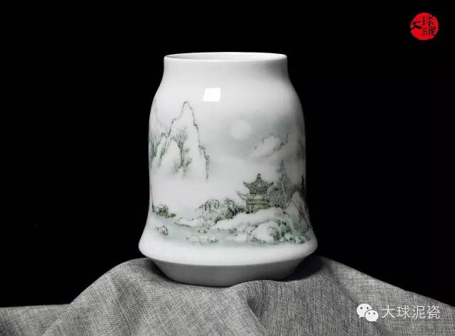 《風(fēng)花雪月》收口瓶,以大球泥為原材料,由工藝美術(shù)大師張志堅(jiān)創(chuàng)作。瓷質(zhì)潔白泛青,透露出水一般的飽滿潤(rùn)澤,造型渾厚大方,圓渾穩(wěn)重,給人以寧?kù)o安詳?shù)撵o態(tài)美。瓶身的畫(huà)面以山水為創(chuàng)作題材,主次分明,對(duì)比強(qiáng)烈,給人包容萬(wàn)物的和諧之美,反映出作者對(duì)大自然的無(wú)限熱愛(ài)和深厚的文化底蘊(yùn)。