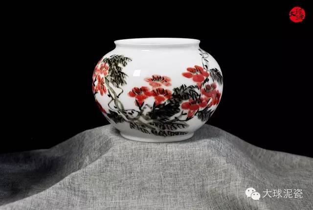 綠蔓如藤不用栽,淡青花繞竹籬開(kāi)。 披衣向曉還堪愛(ài),忽見(jiàn)晴蜓帶露來(lái)。 ——陳宗遠(yuǎn)·《牽;ā 作品介紹 《壯志凌云》小瓷罐,描繪著一副在深秋的傍晚,紅艷艷的牽;ㄨ簿`放的情景。瓷罐上紅艷的牽牛花和含苞的花蕾,點(diǎn)綴在以濃墨勾畫(huà)的枝葉藤蔓上,不僅映襯出牽;ǖ膵擅,也令畫(huà)面更具層次感。一群從遠(yuǎn)處飛來(lái)的雀鳥(niǎo),使得畫(huà)面活潑生動(dòng),令人感受到在這深秋蕭瑟的景色中,仍感覺(jué)到生命的活力。 從造型上來(lái)看,《壯志凌云》小瓷罐,圓身鼓腹,沉穩(wěn)而古樸,使得整件作品顯得更為高挺,其屹立之姿威武而雄壯。而瓷罐上描繪著在深秋的傍晚,一叢叢紅艷艷的牽牛花迎著寒風(fēng)霜露盛開(kāi),其本意為不肯屈服現(xiàn)實(shí)的殘酷,以一種獨(dú)立、堅(jiān)強(qiáng)、自信向人們展示的豁達(dá)之美。
