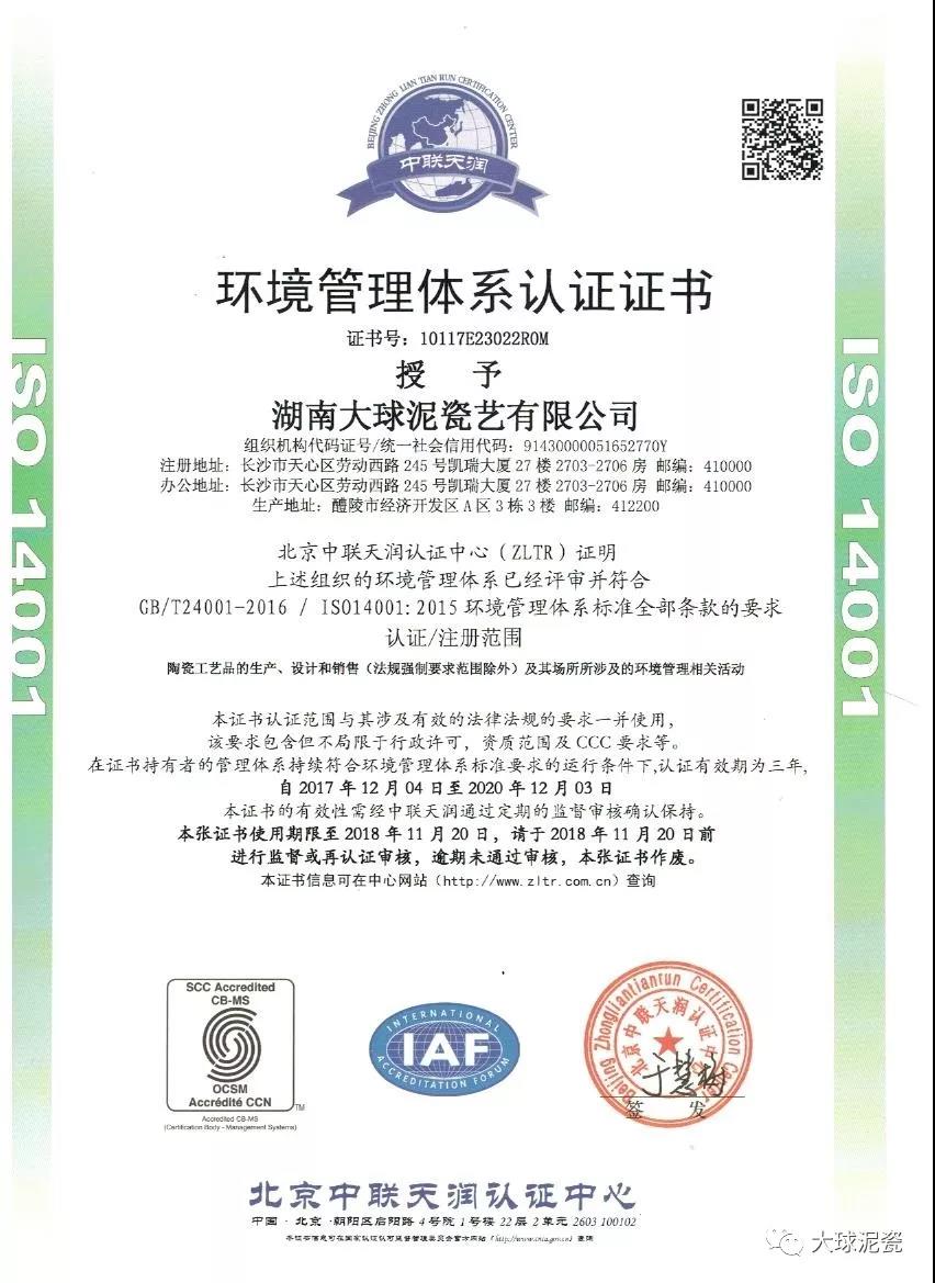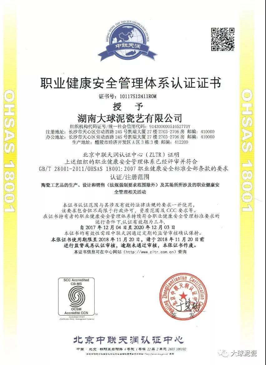 2017年1月05日,湖南大球泥瓷藝有限公司接到質(zhì)量認(rèn)證機(jī)構(gòu)頒發(fā)的環(huán)境管理體系認(rèn)證、職業(yè)健康安全管理體系,標(biāo)志著大球泥瓷藝順利通過ISO14001:2015環(huán)境管理體系認(rèn)證工作、OHSAS 18001:2007職業(yè)健康安全管理體系認(rèn)證。