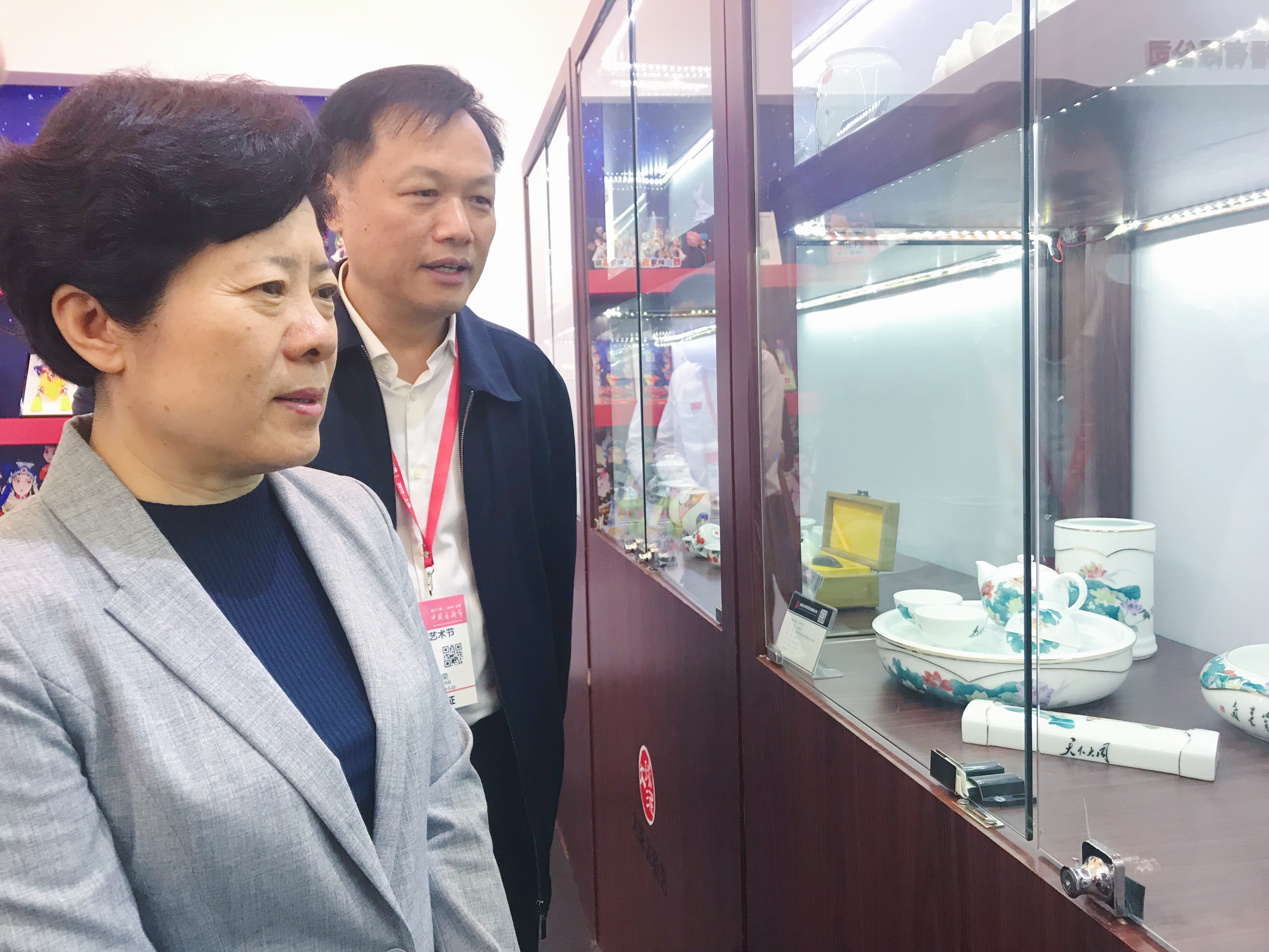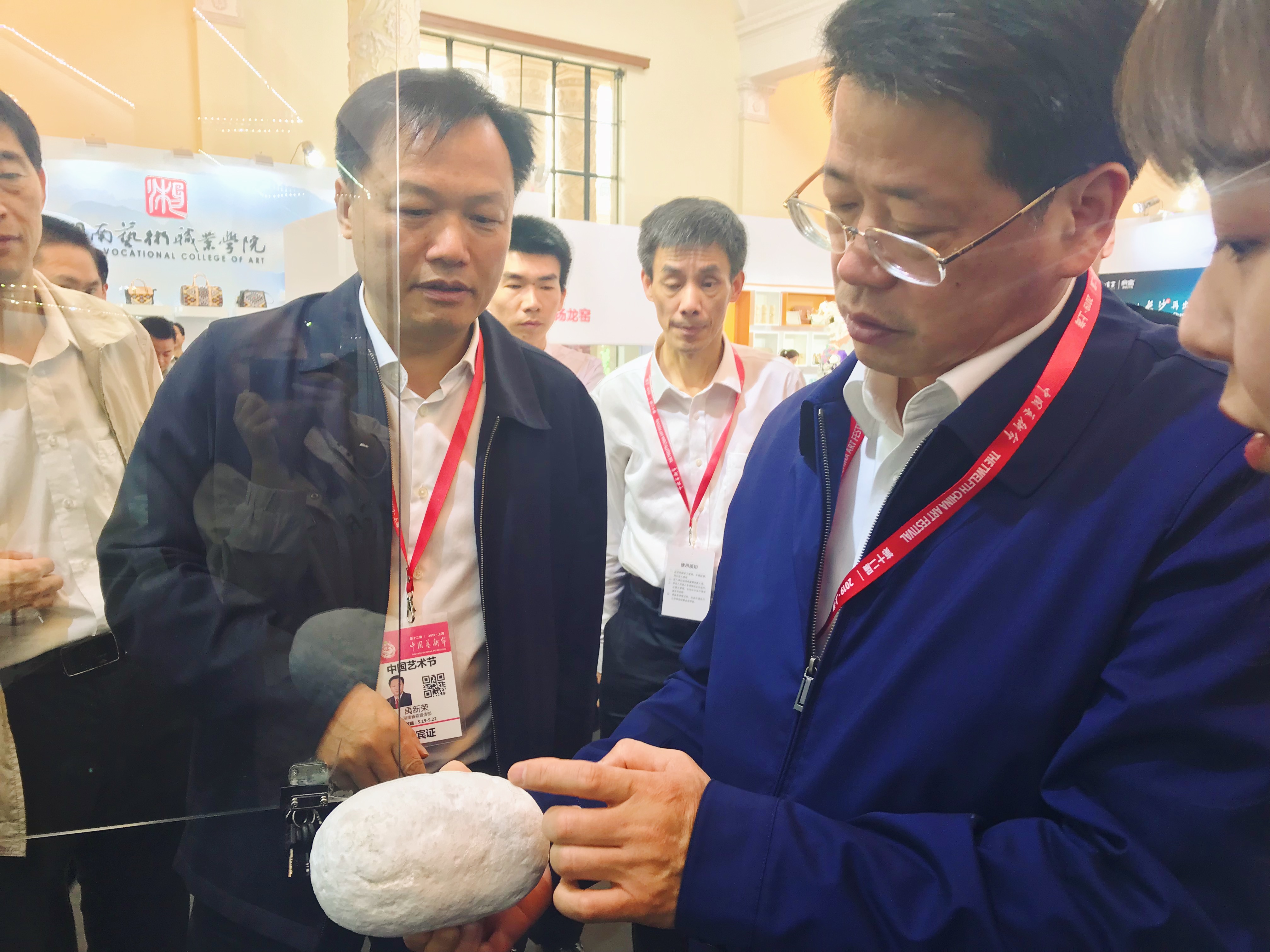 20日上午,湖南省委宣傳部副部長、湖南省文旅廳黨組書記禹新榮陪同湖南省副省長吳桂英、安徽省副省長楊光榮、湖北省副省長楊云彥蒞臨湖南館大球泥瓷藝展區(qū),禹書記親自為各級(jí)領(lǐng)導(dǎo)講解了大球泥原料知識(shí)和展覽的大球泥瓷器作品,領(lǐng)導(dǎo)們流連于展區(qū),只為一睹大球泥瓷器的風(fēng)采。講解完畢,各級(jí)領(lǐng)導(dǎo)對(duì)大球泥瓷藝多年以來堅(jiān)持的工匠精神給予了高度肯定。