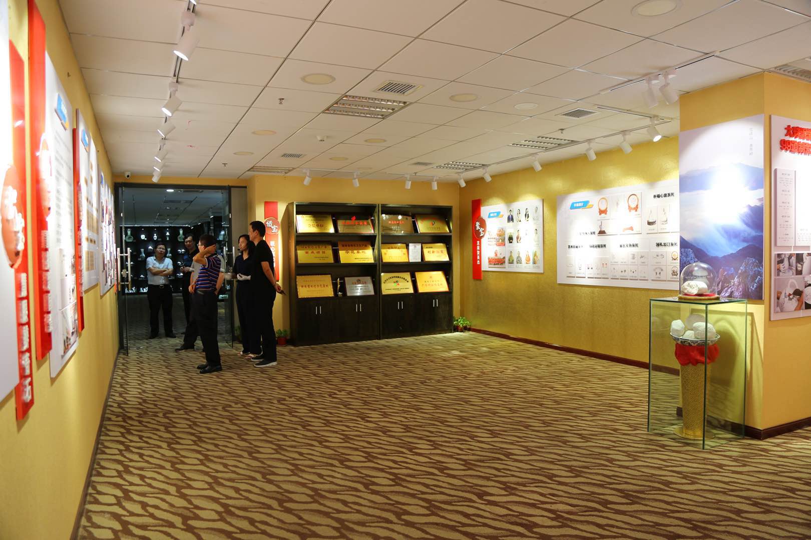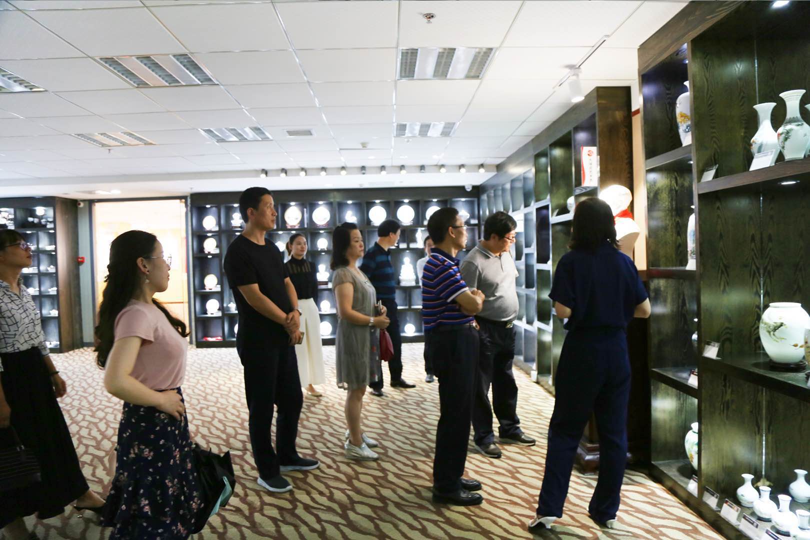隨后考察團移步到大球泥產(chǎn)品展示廳,參觀了紅色偉人系列、祈福平安系列、藝術(shù)收藏系列、生活定制系列、景區(qū)文創(chuàng)系列、外交國禮系列等產(chǎn)品(作品)。當(dāng)講解員把大球泥和優(yōu)質(zhì)泥同一器型的杯子放到燈光下后,考察團一行都驚訝了,一個潔白、溫潤、通透,一個泛黃、暗淡、渾暈,異口同聲感慨到大自然的鬼斧神工,大球泥瓷實屬不可多得的瓷中精品?疾靾F何團長還挑選了一把壺上手,細細撫摸,慢慢回味,說大球泥瓷的感覺就是有說不出的爽!