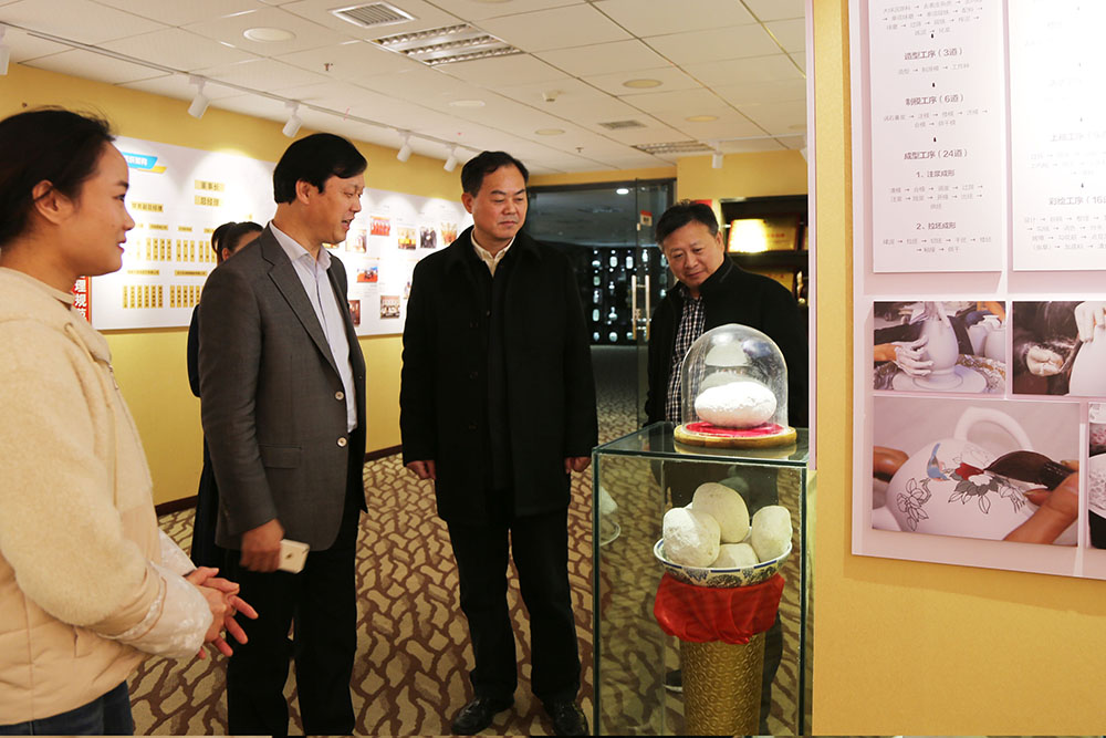 在滕召華董事長(zhǎng)的陪同下,毛主任一行參觀了公司的文化展廳和精品展廳,常務(wù)副總張萍做了精彩講解。從“藏寶”、“識(shí)寶”、“揭寶”、“護(hù)寶”、“探寶”、“惜寶”、“聚寶”、“鑄寶”、“傳寶”、“鑒寶”、“國(guó)寶”十一大板塊,深入淺出地講解了大球泥原料的稀缺性、公司的研發(fā)歷程、文化的提煉形成、產(chǎn)品的定性定位、未來(lái)的發(fā)展方向。毛主任一行看到公司七年時(shí)間里取得了那么多榮譽(yù),給予了充分肯定和高度贊揚(yáng)。