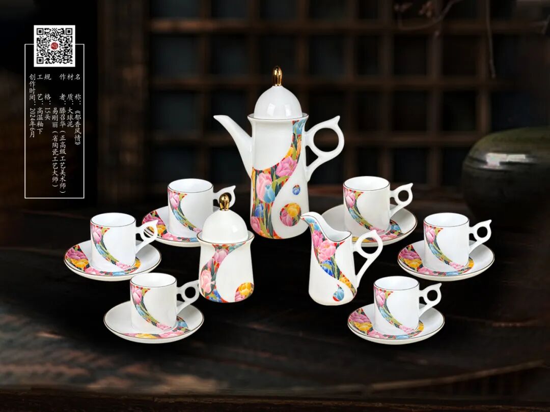 這套咖啡具由國家正高級工藝美術(shù)師滕召華設(shè)計(jì),省陶瓷工藝大師易剛麗創(chuàng)作。采用大球泥專利配方,高溫釉下三重?zé)疲瑯?gòu)造古樸莊重,設(shè)計(jì)簡約時(shí)尚。畫面以阿曼國花郁金香為圖案,主色調(diào)為紅綠交織,輪廓用純金作裝飾線,融合了多種非物質(zhì)文化遺產(chǎn)技藝。整套作品高貴典雅,晶瑩剔透,寓意友誼天長地久。